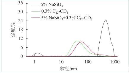 為進(jìn)一步明確兩親性碳點(diǎn)對(duì)硅酸鹽溶液的潤(rùn)滑機(jī)理,通過(guò)動(dòng)態(tài)光散射儀(Malvern Zetasizcrnano ZS90,Malvern,英國(guó))測(cè)定硅酸鈉溶液、硅酸鈉與兩親碳點(diǎn)和硅酸鈉與聚氧乙烯型表面活性劑的混合溶液水動(dòng)力學(xué)直徑,其中散射角為173°,測(cè)試溫度為30℃。如圖6所示,質(zhì)量分?jǐn)?shù)為5%的Na2SiO3粒徑分布在220~800 nm之間,平均粒徑約為514.0 nm;質(zhì)量分?jǐn)?shù)為0.3%的C12-CDS溶液的粒徑主要分布在8~100 nm之間,平均粒徑為43.4 nm;而5%Na2SiO3+0.3%C12-CDS的混合溶液粒徑為10~120 nm,平均粒徑為63.2 nm,C12-CDS的加入使得Na2SiO3聚集體的尺寸大大降低,這表明C12-CDS可以讓Na2SiO3聚集體解聚,這與表面活性劑對(duì)膠體溶液的分散作用相關(guān)。由于大量C12-CDS分子或膠束吸附在Na2SiO3聚集體表面形成具有機(jī)械阻礙作用的水化膜,可對(duì)Na2SiO3聚集體起到穩(wěn)定分散作用。