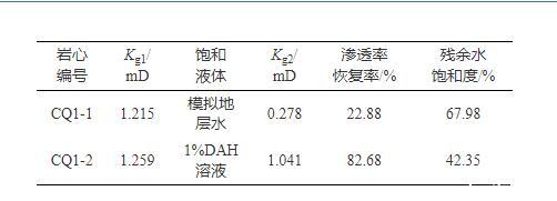 將一塊巖心截為兩塊,測量兩塊巖心干態(tài)下氣測滲透率Kg1,之后將兩塊巖心分別飽和模擬地層水和DAH溶液,使用氮氣在相同壓力下將兩塊巖心驅(qū)替至平衡,測量巖心氣測滲透率Kg2及殘余水飽和度,計算氣驅(qū)后滲透率與干態(tài)下滲透率比值,即為巖心滲透率恢復率。如表2所示,使用模擬地層水飽和巖心后,滲透率恢復率僅有22.88%,水鎖損害嚴重,而使用1%DAH溶液飽和巖心后,滲透率恢復率高達82.68%,水鎖損害程度大幅降低,殘余水飽和度更低,液相返排也更容易。