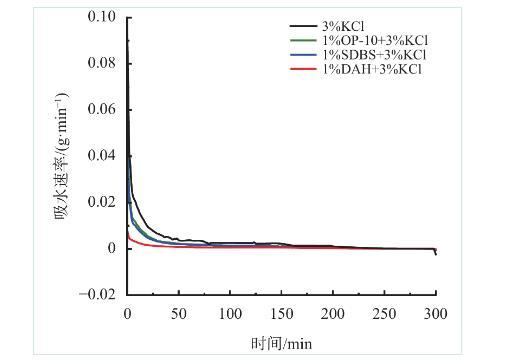 由圖5可以看出,水相會在毛細管力的作用下自吸入巖心,初始階段巖心的自吸水量較大,經(jīng)過200 min后達到平衡,自吸水量不再增加;加入DAH后,巖心自吸水量下降83.1%,且相較于常用防水鎖劑OP-10、SDBS效果更佳。圖6同樣表明,加入DAH后,巖心自吸水速率大幅降低,整個自吸過程中速率緩慢。上述實驗表明,DAH可以減少因毛細管力被吸入地層的水相,從而降低水鎖損害發(fā)生的風險。