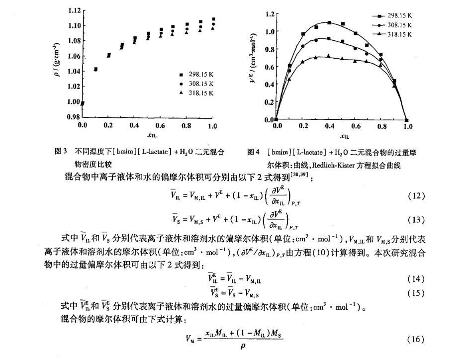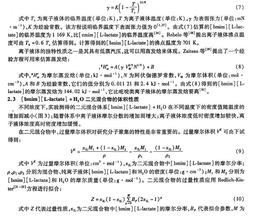 本次研究測定了不同溫度下手性離子液體[bmim][L-lactate]以及二元混合物[bmim][L-lactate]+H2O的密度和表面張力。結果表明,離子液體的密度和表面張力均隨著溫度的增加而減小;并且對純離子液體的熱膨脹系數、表面熵、表面焓以及其臨界溫度進行了計算。研究了二元混合物的體積性質(過量摩爾體積、偏摩爾體積、表觀摩爾體積、過量偏摩爾體積)、表面性質,發現二元混合物的密度隨溫度的增加而減小;所研究的二元混合體系的密度均隨著體系中離子液體摩爾分數的增加而增大;混合物中手性離子液體與分子溶劑間具有強的相互作用。
