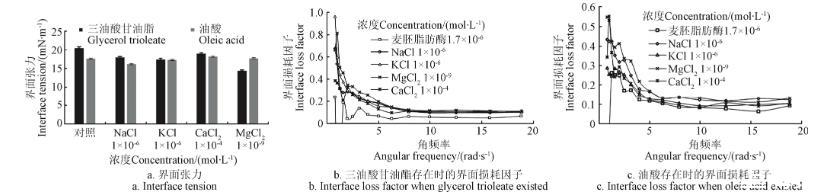從圖8b和圖8c可以看出,三油酸甘油酯或油酸存在時,無機鹽對tanδ的影響規律性較差,出現上述情況的原因可能是因為無機鹽離子降低了麥胚LA在油水界面的溶解度,從而為三油酸甘油酯或油酸保留了更多的界面面積,有利于更多的三油酸甘油酯或油酸占據有效界面,以至于降低了底物或產物存在時的油水界面張力。