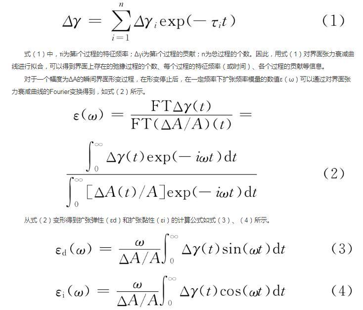 本研究中采用界面張力弛豫法,通過對受擾動界面張力衰減曲線擬合獲得界面張力改變量隨時間變化的函數(shù)關(guān)系,再經(jīng)過Fourier變換,計算得到界面擴張參數(shù)的全頻率譜,從而獲得界面上活性分子行為的信息。