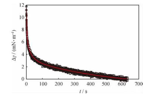 當(dāng)活性分子界面吸附膜達到平衡時,對其實施一個突然的擾動,則界面上各活性分子均會對此擾動產(chǎn)生響應(yīng)。界面和體相間分子交換的快慢、分子在界面上排列的變化、分子間相互作用的強弱等信息均會反映在擾動停止后的界面張力衰減曲線上。典型的界面張力(Δγ)衰減曲線及其擬合曲線如圖1所示。