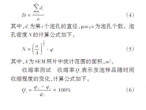 其中,A為SEM照片中統計范圍的面積,m2。收縮率測試收縮率Qi表示發泡樣品隨時間收縮程度的變化,計算公式如下。