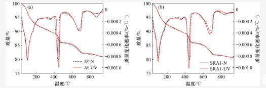 通過(guò)TG-DTG程度對(duì)比分析60 d齡期時(shí)2種環(huán)境條件下水泥水化,熱重分析結(jié)果圖6和表4所示。化學(xué)結(jié)合水和氫氧化鈣的含量可以直觀地反映水化速率和水化程度。如表4所示,經(jīng)過(guò)強(qiáng)紫外線照射后,各組樣品的化學(xué)結(jié)合水含量和氫氧化鈣含量呈下降趨勢(shì),這是因?yàn)閺?qiáng)紫外線照射下樣品中的自由水會(huì)更快地蒸發(fā),最終導(dǎo)致水化程度降低。此外,對(duì)比2種環(huán)境下的碳酸鈣含量發(fā)現(xiàn),強(qiáng)紫外輻射會(huì)促進(jìn)水泥石的碳化。熱重分析結(jié)果與已有的研究結(jié)果相似。