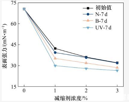 據(jù)以往研究,SRA在水泥基材料表面的吸附率通常在10%以下,90%以上的SRA分子溶于溶劑中(包含吸附在氣液界面上的部分)。因此,SRA減縮的理論基礎(chǔ)主要是毛細(xì)管張力理論。為了進(jìn)一步探索減縮劑在強(qiáng)紫外線輻射環(huán)境下的作用機(jī)理,測(cè)試了減縮劑溶液的初始表面張力,以及溶液經(jīng)過(guò)3種不同環(huán)境(N,UV,B)處理7 d后的表面張力。試驗(yàn)結(jié)果如圖8所示。