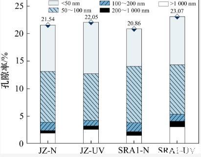 此外,摻入SRA對(duì)樣品的總孔隙率沒(méi)有顯著影響,但降低了與收縮密切相關(guān)的介孔率(<50 nm)。值得注意的是,SRA試驗(yàn)組樣品的介孔率大小關(guān)系(SRA-UV>SRA-N)與干縮值大小關(guān)系(SRA-N>SRA-UV)不一致,說(shuō)明介孔率不能作為評(píng)判SRA減縮效果的唯一指標(biāo),可能還受到SRA對(duì)孔隙溶液表面張力的影響。同時(shí),由于減縮劑使水泥早期水化速度減慢,未參與水泥水化的自由水相對(duì)較多,漿體硬化與微結(jié)構(gòu)形成減慢,SRA的摻入提高了水泥凈漿中的大孔比例。這表明,盡管SRA能夠明顯降低水泥石的干燥收縮,但不能忽視其加速水泥石水分散失所導(dǎo)致的結(jié)構(gòu)劣化問(wèn)題。
