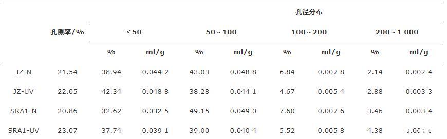 由圖7和表5可以看出:強(qiáng)紫外線輻射使各組樣品的總孔隙率、介孔率(2~50 nm)及大孔率(尤其是200 nm以上的孔)增加,由于彎月面的表面張力效應(yīng),介孔的毛細(xì)管產(chǎn)生更高的毛細(xì)管應(yīng)力,導(dǎo)致暴露在強(qiáng)紫外輻射環(huán)境中的水泥石產(chǎn)生更大的干燥收縮。同時(shí),經(jīng)過(guò)強(qiáng)紫外線照射后,樣品中大于200 nm的孔隙比例增加。這是由于強(qiáng)紫外線輻射環(huán)境下,水泥凈漿的水化程度降低及水分散失增加導(dǎo)致的。