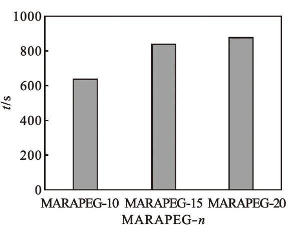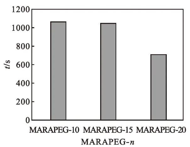 馬來酰蓖麻油酸聚乙二醇(n=10、15、20)酯的潤濕性能如圖5所示。由圖5可知:產(chǎn)品的潤濕時(shí)間隨著聚乙二醇聚合度的增大而增長。氧乙基數(shù)增加,其親水性增強(qiáng),降低表面張力的能力減弱,潤濕性能減弱。