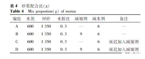 制備四組砂漿,B、D組中的水用SRA按照5%(質量分數)進行替換。B組中的SRA與水混合后直接加入水泥中攪拌,A組除不含SRA外與B組一致。而C、D組分兩步混合,C組先只加入95%的水進行攪拌,完成后用塑料薄膜覆蓋攪拌鍋靜置15min,然后加入余下的水以中速攪拌3min,D組與C組唯一不同的地方在于先加入95%的水,最后加入的是余下5%的SRA,具體如表4所示。