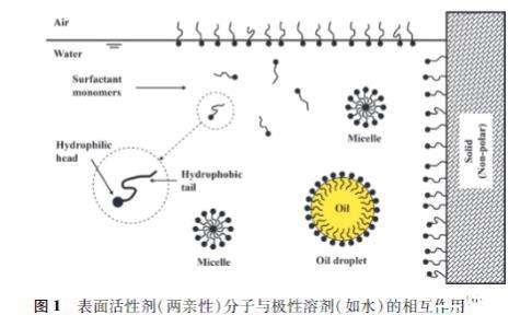 圖1表面活性劑(兩親性)分子與極性溶劑(如水)的相互作用