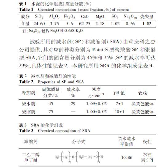 試驗所用的減水劑(SP)和減縮劑(SRA)由重慶科之杰公司提供,其對應的種類分別為PointS型聚羧酸SP和聚醚型SRA,它們的固含量分別為45%和75%,SP的減水率可達29%,具體性能見表2.本研究所用SRA的化學組成見表3.