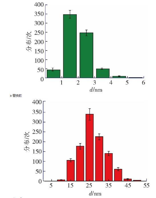 納米氣泡的高度在8~20 nm范圍之內,直徑在100~500 nm范圍之內,圖3c為圖3b中典型納米氣泡的截面圖。掃描得到納米氣泡圖像以后,在該表面上進行力曲線測量實驗,如圖2b所示。所有離曲線的‘跳進’距離均大于10 nm且是變化的,同時,由雙電層引起的斥力也消失了,不符合DLVO理論。這種‘跳進’距離不同的長程力應該是因為醇-水替換后HOPG表面上生成的納米氣泡造成的。圖3b中納米氣泡的覆蓋率約為21.8%,在該表面不同位置測量得到的力曲線必然會存在探針-HOPG相互作用的情況,即不都是探針-氣泡的相互作用的情況。然而,根據醇-水替換前后多次測量力曲線得到“跳進”距離d的統計分析(圖4a和圖4b),醇-水替換前測量得到的力曲線的“跳進”距離大部分都小于5 nm(99%),而醇-水替換后測得的力曲線的“跳進”距離均大于10 nm。這表明,醇-水替換后即使不是探針-氣泡相互作用的情況下,探針與HOPG表面的相互作用時仍然存在長程引力,而這應該是IGE造成的。該研究結果與Peng等人的研究結果一致,驗證了Limbeek對IGE與納米氣泡共存的假設。