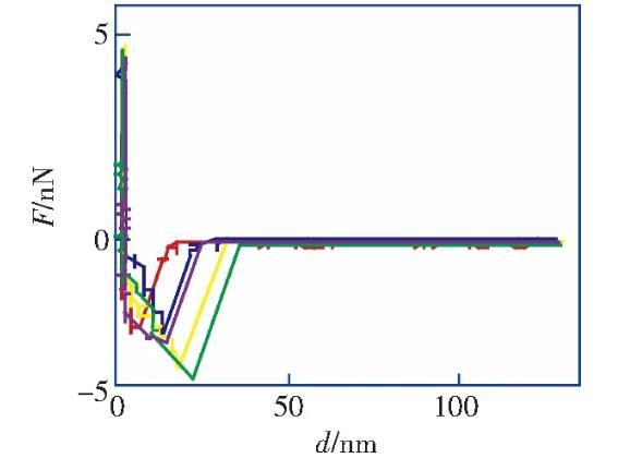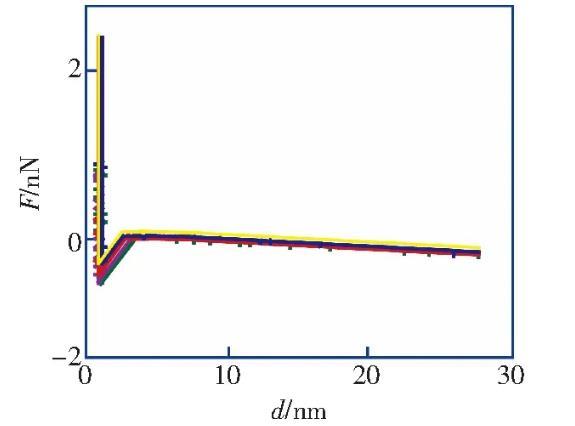 筆者利用原子力顯微鏡實驗測量了HOPG表面在醇-水替換前后的力距離曲線,發現醇-水替換前進針曲線的跳進距離小于5 nm,滿足DLVO理論;而在醇-水替換后納米氣泡覆蓋率為21.8%的情況下,進針曲線的跳進距離均大于10 nm,不能再用DLVO理論解釋,證明了IGE與納米氣泡共存這一現象。根據改進的Laplace-Young方程,結合文獻中對納米氣泡線張力值的計算結果,分析負的線張力對過渡區內局部表面張力及局部固-液界面的影響,導致納米氣泡的接觸角反常小的原因之一。分析并討論雜質對納米氣泡接觸角的影響,指出IGE與納米氣泡共存、線張力及雜質影響的共同作用是導致納米氣泡接觸角“反常小”的原因。