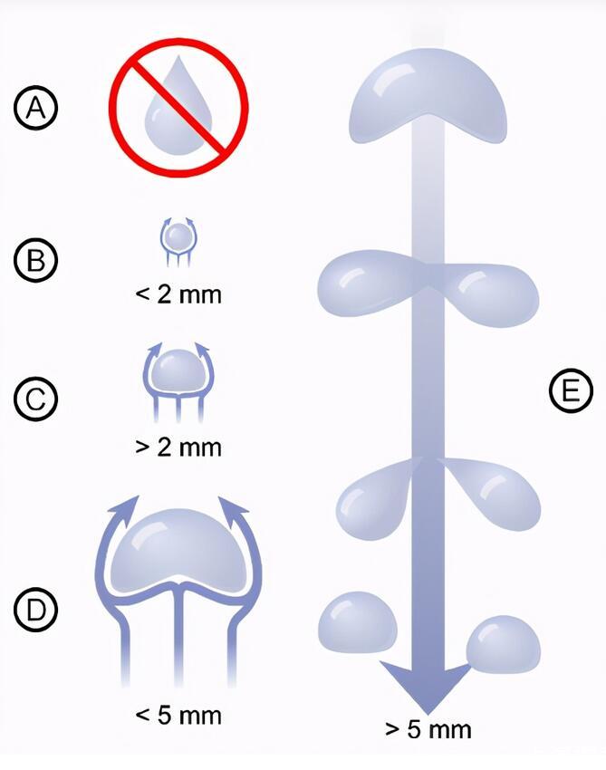 雨滴在被分割之前保持著的最大尺寸被稱(chēng)作為「雨滴臨界破碎尺寸」,物理學(xué)則用「臨界半徑」來(lái)表示,在各種不同的氣流條件下,「雨滴臨界破碎尺寸」是不同的: