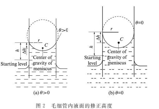 (1)接觸角與修正高度對毛細管內半徑的影響。測定無水乙醇與毛細管內壁的接觸角(θ)。采用式(2)標定毛細管的內半徑(r),比較標定內半徑與生產標號的差異。