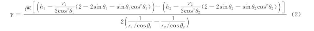 式中:ρ為試驗溫度下液體的密度;g為當地重力加速度;h1、h2為自同一水平面起,差分組合的毛細管內凹液面上緣的最大上升高度,因表面張力計算僅需同質異徑毛細管內液面的高度差,圖1中的起始平面可在管外瀝青液面與毛細管上升高度間指定;θ1、θ2為毛細管內凹液面擬合為球冠狀之后的接觸角;r1、r2為差分組合的毛細管內半徑大小。