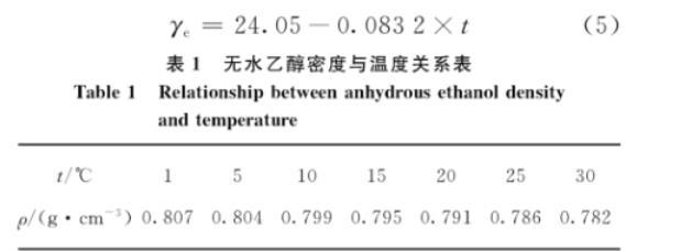 毛細管的實際內半徑r與生產標號NRI有一定差異,需進行標定。文中毛細管內半徑在0.08——0.50mm范圍內,難以直接測定。利用式(2),選擇無水乙醇作為標定液,內半徑較粗、可測的毛細管作為基準管,反向標定較細毛細管的內半徑。標定過程為:(1)通過電荷耦合器件(CCD)相機拍攝,并獲取基準管的內半徑。(2)使用相機拍攝毛細管內液面上升高度,以及無水乙醇與管內壁的接觸角;(3)記錄試驗溫度t.根據無水乙醇的表面張力計算公式和溫度~密度特性表獲得其表面張力γe與密度ρ,見式(5)和表1.(4)將上述參數代入式(2),得到毛細管的內半徑值。
