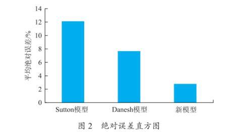 式中,σgw為氣水界面張力,mN/m;ρg為氣相密度,g/cm3。比較新模型式(4)與Danesh模型、Sutton模型在密度差大于0.4 g/cm3時(shí)的誤差,如圖2所示。Danesh模型平均絕對(duì)誤差為7.7%;Sutton模型平均絕對(duì)誤差為12.1%,而新模型平均絕對(duì)誤差為2.8%,計(jì)算精度更高。