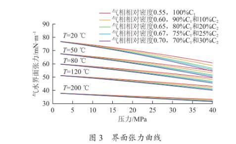 如圖3所示為利用新模型繪制的不同溫度和壓力下的界面張力曲線。從圖中可知,壓力越大,溫度越高,氣水界面張力越小;氣體相對(duì)密度越大,氣水界面張力越小。當(dāng)壓力和溫度分別為0~40 MPa和20~200℃時(shí),界面張力范圍為30~75 mN/m,不能看成常數(shù)。
