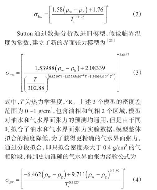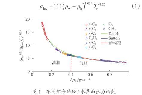 式中,Δρwh為烴水密度差,g/cm3;σhw為烴水、氣水或者油水界面張力,mN/m;ρw為水的密度,g/cm3;ρh為烴的密度或者氣和油的密度,g/cm3;Tr為擬對(duì)比溫度。