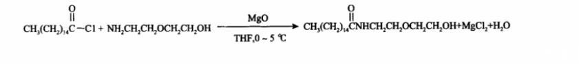 1.2.1棕櫚酸二甘醇酰胺的合成稱取9.10 g二甘醇胺,放入裝有攪拌器、溫度計(jì)和恒壓漏斗的500 mL三口燒瓶中,并加入約70 mL水。通過(guò)冰浴將溫度控制在0~5℃范圍內(nèi),加入溶劑210 mL(V(水)∶V(四氫呋喃)=1∶3)及氧化鎂16.80 g(n(氧化鎂)∶n(二甘醇胺)=5∶1)。攪拌約30 min后,稱取22.88 g棕櫚酰氯溶解于70 mL四氫呋喃,轉(zhuǎn)移到恒壓漏斗中,緩慢滴加到三口瓶中,滴加時(shí)間為0.5 h左右,在0~5℃下攪拌反應(yīng)2~2.5 h。反應(yīng)物物質(zhì)的量比為n(棕櫚酰氯)∶n(二甘醇胺)=1∶1.02。反應(yīng)結(jié)束后將反應(yīng)混合物倒入布氏漏斗中抽濾,除去過(guò)量的氧化鎂和生成的氯化鎂,收集濾液,旋蒸除去溶劑,最后于55℃下真空干燥12 h,得到目標(biāo)產(chǎn)物,外觀為白色粉末。