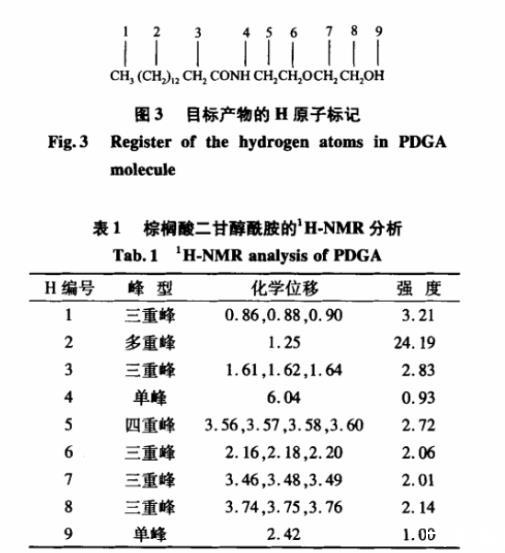 1)以四氫呋喃作溶劑,在氧化鎂存在下,通過棕櫚酸酰氯和二甘醇胺在0~5℃下反應可以合成棕櫚酸二甘醇酰胺。在優化反應條件下產率可達到95%。經紅外、質譜、核磁等表征,合成產物與目標產物的分子結構相符,為一種單一化合物。