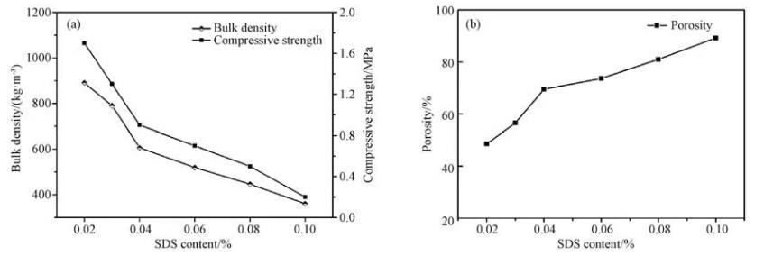 圖1為固含量60%、SDS摻量分別為0.02%、0.04%、0.06%、0.08%、0.1%下所制備的多孔陶瓷坯體,經(jīng)過1190℃、保溫2 h燒結(jié)后的樣品性能。從圖中可以看出,多孔陶瓷樣品的體積密度和抗壓強(qiáng)度隨發(fā)泡劑摻量的增加而減小。當(dāng)SDS的摻入量由0.02%提高至0.1%時(shí),樣品的密度由890.53降至361.0 kg/m3,抗壓強(qiáng)度由1.7下降至0.2 MPa。當(dāng)SDS溶于水并經(jīng)過高速攪拌后,SDS分子可以吸附到氣液界面上降低表面張力并產(chǎn)生大量的氣泡,這些氣泡會(huì)緊密堆積在一起,氣泡之間有液膜將其隔開,將氣泡引入到陶瓷漿料中后,陶瓷原料分散在氣泡液膜間,形成骨架支撐,干燥后陶瓷原料液相消失,固化形成含孔隙的多孔陶瓷坯體,引入的氣泡越多,多孔陶瓷的孔隙率越高,孔壁越薄,陶瓷骨架越細(xì);當(dāng)氣泡的引入量過多時(shí),骨架易發(fā)生斷裂,此時(shí)多孔陶瓷的抗壓強(qiáng)度就會(huì)降低。
