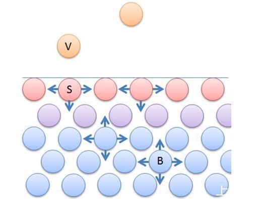 在水中,如B所示,內(nèi)部水分子所受鄰近相同分子的作用力是對稱的,各方向的力相互抵消。但物質表面層分子與內(nèi)部分子周圍的狀況不同,水最外層分子會受到整個水滴內(nèi)部分子的斥力,而抵消這個斥力的便是水的表面張力。