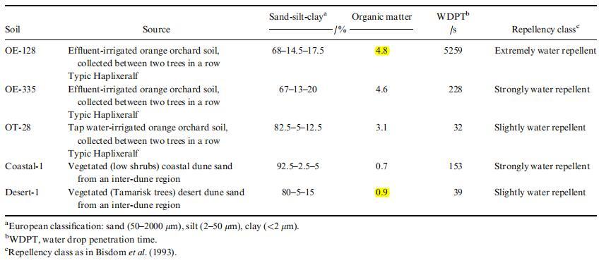 來自以色列不同地區(qū)的五種防水土壤 過篩(1 毫米)并在室溫下儲存在玻璃容器中 實驗室條件(平均溫度 ? 24.5°C,平均 相對濕度 (RH) ? 65%)。 兩種土壤 (OE-128 和 OE-335; 典型的單氟草胺)是從相同的 污水灌溉的商業(yè)柑橘園與以前一樣 研究(Wallach 等人,2005 年;Graber 等人,2006 年)位于 以色列沿海平原的中部(31°59¢30.562)。 一 土壤(OT-28;典型單頭草)是從水龍頭中獲得的 同一商業(yè)果園的水灌溉柑橘地塊。 一種 沙丘沙是從附近的沙丘間地區(qū)獲得的 位于地中海的尼察尼姆自然保護區(qū) (31°16¢37.242) 海(Coastal-1)和來自沙間地區(qū)的粘土砂 內(nèi)蓋夫北部沙漠 (30°52¢02.592; (Desert-1) 的 Halutza 附近。表 1 列出了顯著的土壤特征。