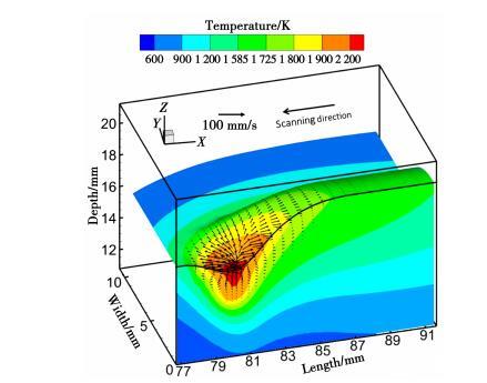 電弧壓力是形成熔池凹陷區的驅動力。熔池中心表面的液態金屬受到較大的壓力,向周圍移動。液態金屬在熔池中心區域流速最大,而越靠近熔池底部流速越小。這種流動模式允許更多的熱量從熱源傳遞到熔池底部,從而導致深度滲透。如圖2所示,液態金屬在電弧壓力的驅動下被推到熔池的后部,并在凝固時形成冠狀。