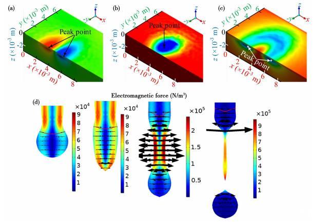圖1電磁力分布:(a—c)熔池內部笛卡爾坐標系x、y、z方向;(d)熔滴內部