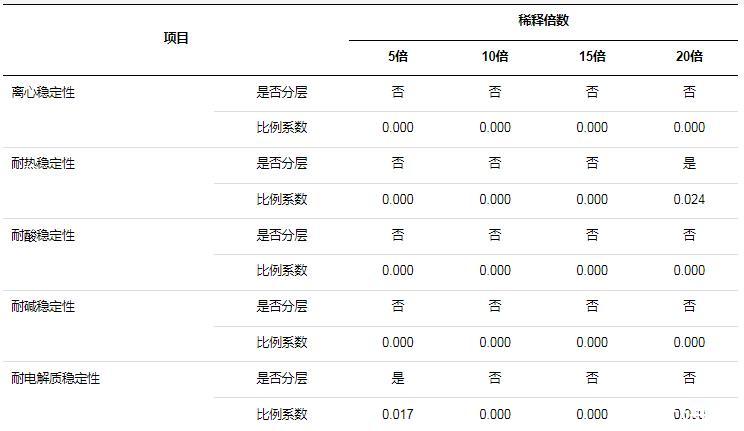 1)經過稀釋后,耐熱穩定性、耐電解質穩定性兩個測試項目雖然出現分層情況,但是比例系數均在0.1以下,氨基改性硅油柔軟劑保持較好的穩定性;