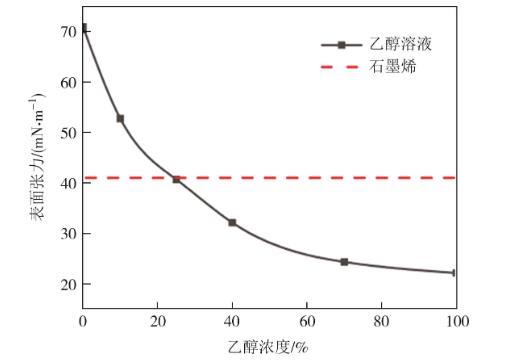 但是NMP存在價格昂貴、環(huán)境污染大的缺點,因此尋求一種環(huán)境友好、成本低的球磨溶劑對微晶石墨細(xì)化產(chǎn)業(yè)化具有重要的意義。水和乙醇的表面張力分別為70.95 mN·m-1和22.17 mN·m-1,我們采用一定體積比的乙醇和水調(diào)配出與微晶石墨表面能接近的乙醇水溶液,并以此為溶劑球磨微晶石墨,研究溶劑的表面張力對球磨后微晶石墨粒徑的影響。從圖1可知,25%乙醇溶液的表面能為40.69 mN·m-1,與石墨烯的表面能(40.80 mN·m-1)相近,從圖2可知,其對應(yīng)的微晶石墨中位粒徑最小。當(dāng)溶劑的表面能與微晶石墨表面能相近時,微晶石墨能更好地分散在溶劑中,從而提高球磨效率。所以在本工作中,選擇25%的乙醇水溶液作為球磨溶劑。