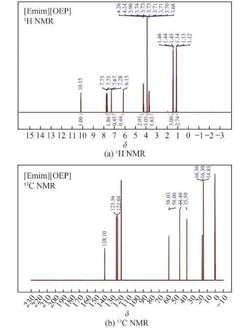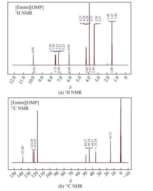 圖1 1-乙基-3-甲基咪唑亞磷酸甲酯鹽的核磁共振氫譜圖和碳譜圖
