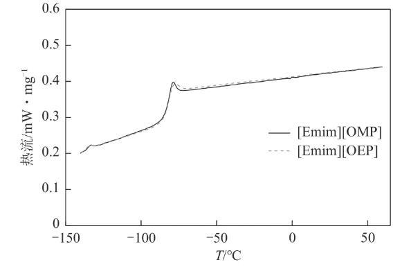 使用差示掃描量熱法對離子液體的固液相變進行了研究(圖4),結果表明[Emim][OMP]與[Emim][OEP]不存在熔點或凝固點,只有玻璃化轉變。[Emim][OMP]和[Emim][OEP]的Tg分別為-84.87℃和-85.00℃,即[Emim][OMP]與[Emim][OEP]并不存在真正意義上的固液相變,而只有冷卻或加熱過程中產生的無定形玻璃態與液態之間的轉變。