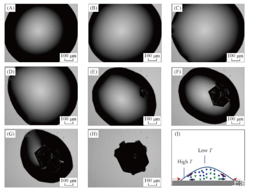 實(shí)驗(yàn)發(fā)現(xiàn),純水液滴和NaCl水溶液液滴在玻璃基底上蒸發(fā)時(shí)其三相接觸線均發(fā)生不同程度的收縮。圖1所示為NaCl溶液液滴的蒸發(fā)過程。可以看出,接觸線的收縮并非連續(xù)不斷,而是在一定時(shí)間內(nèi)先保持“釘扎”[圖1(A),(B)].在此過程中,接觸角不斷減小,從而使得表面張力的水平分力增大,當(dāng)其超越基底對(duì)接觸線產(chǎn)生釘扎作用時(shí),就會(huì)引起接觸線的收縮。由于基底結(jié)構(gòu)的不均勻性,液滴各方向的收縮也可能是不均勻的,如圖1(C)——(H)所示。由于蒸發(fā)過程中接觸線不能釘扎,蒸發(fā)造成的Marangoni對(duì)流以及重力沉降作用使得NaCl在液滴中心區(qū)域富集,如圖1(I)所示。因而NaCl晶體首先在液滴中心區(qū)域析出。