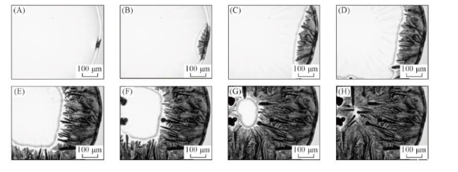 當(dāng)液滴中NaCl含量較高時(shí),鹽并不是在液滴的邊緣析出,而是在靠近邊緣的位置析出。這可能是液滴蒸發(fā)初期毛細(xì)補(bǔ)償流與Marangoni對(duì)流的競(jìng)爭(zhēng)使得溶質(zhì)在近邊緣位置富集所致。此時(shí),液滴邊緣已成為凝膠區(qū)(表面張力小),而內(nèi)部仍為液態(tài)區(qū),因而析出的NaCl晶體將在內(nèi)部液相表面張力的牽引下向內(nèi)部運(yùn)動(dòng),并逐漸形成更大尺寸的塊狀鹽晶體。說明當(dāng)NaCl濃度較高時(shí),即使存在PTFE顆粒,仍有部分NaCl會(huì)按其自身生長特性形成多面體結(jié)構(gòu)。而液滴邊緣凝膠區(qū)枝晶的生長則與圖2相類似,呈現(xiàn)出NaCl與膠體顆粒之間復(fù)雜耦合的特點(diǎn)。
