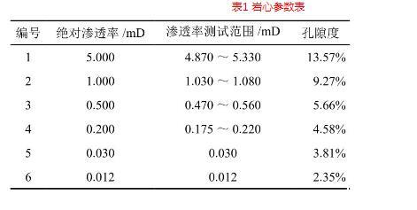 具體實驗方案如下:①滲透率,分別選取5.0 mD、1.0 mD、0.5 mD、0.2 mD、0.03 mD和0.012 mD的巖心進行實驗;②水封程度,根據式(1)設計水封段塞長度為0.1~4.0 cm;③裂縫內壓力,通過改變出口端壓力來模擬裂縫中壓力,巖心出口端回壓分別設置為5.0 MPa、3.0 MPa、1.0 MPa和0.1 MPa,圍壓設定為15 MPa;④潤濕性,首先開展巖石表面潤濕性測試實驗,弄清不同潤濕反轉劑濃度時的潤濕特性,然后利用潤濕反轉劑濃度分別為0.001 5%、0.003 0%、0.010 0%的溶液改變巖心潤濕性。