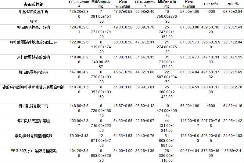 本研究除了測試表面活性劑溶液的表面張力、泡沫形態(tài)、泡沫密度保留率(ηBC)和泡沫體積保留率(ηV)外,還測試了最大泡沫含液量(Vliquid foam max)、析液半衰期(tFLS 50%)、氣泡個數(shù)半衰期(tBC1/2)、泡沫液體體積比率(MD)等指標,結果如表4和表5所示。