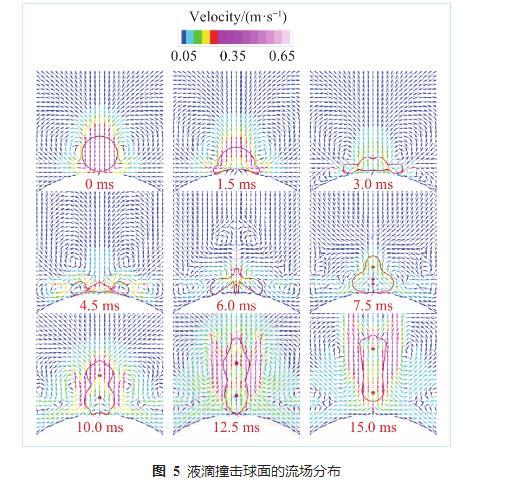 為了研究液滴撞擊高溫球面過程中液滴與氣膜的動(dòng)力學(xué)及傳熱學(xué)特性,以液滴撞擊623.15 K球面為例展開模擬,液滴的撞擊速度為0.348 m/s,尺寸為d=1.61 mm,We=8.6.圖4展示了液滴撞擊過程中速度場(chǎng)、溫度場(chǎng)及壓力場(chǎng)的變化,圖5展示了液滴撞擊過程中流場(chǎng)的變化。