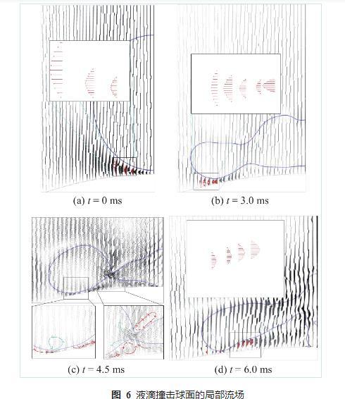 從圖中可以看出,0 ms時(shí),液滴開始接觸壁面,液滴主要在慣性力作用下沿球表面快速鋪展,受球面形狀的影響,重力對(duì)液滴的鋪展起到一定作用,液滴通過克服黏性損失和液滴變形將動(dòng)能轉(zhuǎn)化為表面能;1.5 ms時(shí),由于蒸汽積壓,液滴底部呈扁平狀,此時(shí)氣膜較薄,底部球面上存在熱流密度明顯較大的環(huán)狀區(qū)域,同時(shí)液滴運(yùn)動(dòng)方向由軸向開始轉(zhuǎn)變?yōu)閺较颍?.0 ms時(shí),隨著液滴繼續(xù)鋪展,流體向液滴前端積聚,徑向速度與壓力都開始減小,同時(shí),液滴下方蒸汽流出后,周圍空氣沿球面流向液滴底部,形成回流;4.5 ms時(shí),液滴達(dá)到最大鋪展,隨后,在表面張力的作用下開始收縮,外部環(huán)狀區(qū)域壓力與速度都較小,中心點(diǎn)處氣膜較薄,具有較高的熱流密度,同時(shí),因?yàn)橐旱涡纬闪酥虚g低四周高的結(jié)構(gòu),周圍氣流形成多個(gè)渦流;6.0 ms時(shí),液滴逐漸收縮,外側(cè)速度與壓力明顯小于中心內(nèi)部,且液滴運(yùn)動(dòng)方向由原來的周向變?yōu)檩S向,中心區(qū)域與外側(cè)氣膜厚度都較薄,且中心區(qū)域更薄,因此熱流密度更大,多個(gè)渦流都在遠(yuǎn)離液滴;7.5 ms時(shí),液滴進(jìn)一步收縮,外側(cè)速度與壓力都在升高,軸向方向速度減弱,由于液滴底部氣膜厚度不均勻,導(dǎo)致球面熱流密度分布呈多環(huán)形,不同區(qū)域差異較大,同時(shí),因?yàn)橐旱蔚撞繅毫^高,對(duì)底部氣膜擠壓作用較強(qiáng),使氣流逸散速度進(jìn)一步提高;9.0 ms-13.0 ms階段,液滴逐漸脫離壁面,壁面熱流密度隨之減小,直到液滴完全脫離壁面,周圍氣流在液滴的帶動(dòng)下逐漸沿軸向遠(yuǎn)離球面,壁面附近氣流速度逐漸減小。