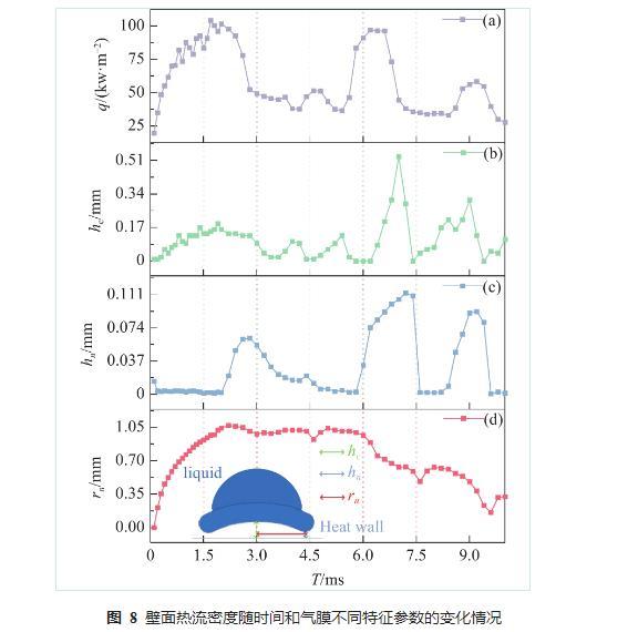 從圖7可以看出,相對(duì)于壓強(qiáng)的變化情況,壁面的熱流密度與氣膜的相關(guān)性更強(qiáng),氣膜厚度的變化會(huì)引起熱流密度的變化。圖8是液滴撞擊過程中壁面平均熱流密度及氣膜不同特征參數(shù)隨時(shí)間的變化情況,圖8(a)是壁面平均熱流密度,可以看出,平均熱流密度的變化情況受液滴中心氣膜厚度影響較大,在前期鋪展階段中心氣膜厚度出現(xiàn)明顯波動(dòng)時(shí)熱流密度也相應(yīng)波動(dòng),在液滴收縮階段,熱流密度變化明顯與頸部氣膜厚度成正相關(guān);圖8(b)是液滴中心氣膜高度,中心氣膜高度波動(dòng)最為劇烈,在液滴撞擊前3 ms內(nèi),即液滴鋪展階段先伴隨不穩(wěn)定波動(dòng)升高再保持穩(wěn)定,當(dāng)液滴開始收縮時(shí)出現(xiàn)大范圍的波動(dòng);圖8(c)是液滴頸部氣膜厚度,頸部與中心點(diǎn)通常為液滴底部氣膜厚度最薄點(diǎn),也是熱流密度峰值點(diǎn);圖8(d)是液滴的頸部半徑長度,它的變化規(guī)律與液滴鋪展情況相似,且可以用來表示液滴與壁面的有效換熱面積。相較其他兩項(xiàng)特征參數(shù)而言,液滴中心氣膜厚度顯然對(duì)熱力學(xué)能具有更高的影響。