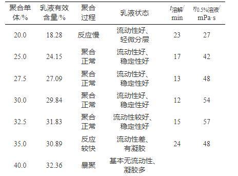 乳液中聚合物有效含量越高,增黏能力越強,使用成本越低,聚合單體濃度直接決定乳液有效含量,并通過影響聚合反應過程進而影響減阻劑綜合性能。