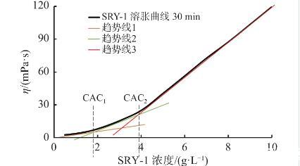 據研究表明,締合聚合物溶脹經歷3個階段,分別對應了兩個黏度突變的點,即臨界締合濃度CAC;通過繪制聚合物溶液黏度-濃度曲線,擬合分析得到3個階段的趨勢線及公式,兩兩相交的點取絕對值即為臨界締合濃度值,計算得CAC1,CAC2,如圖3所示。根據曲線可以看出,在CAC1之前,溶液黏度增長趨勢較緩慢,當達到CAC1并向CAC2過渡時,溶液黏度增長相對加快,超過CAC2后,溶液黏度迅速增加,1.0%用量下終黏可達110 mPa·s以上。