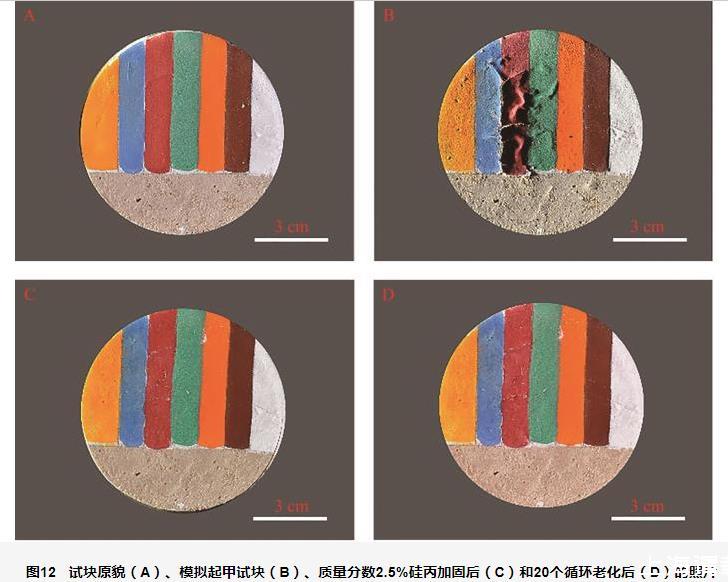 圖12可以看出,硅丙乳液加固前后與加固老化20個循環后顏料層無明顯差異,這一結果說明硅丙具有較好的兼容性、透氣性和耐老化性,因而可以作為一種性能優異的膠凝材料用于修復起甲的壁畫中。