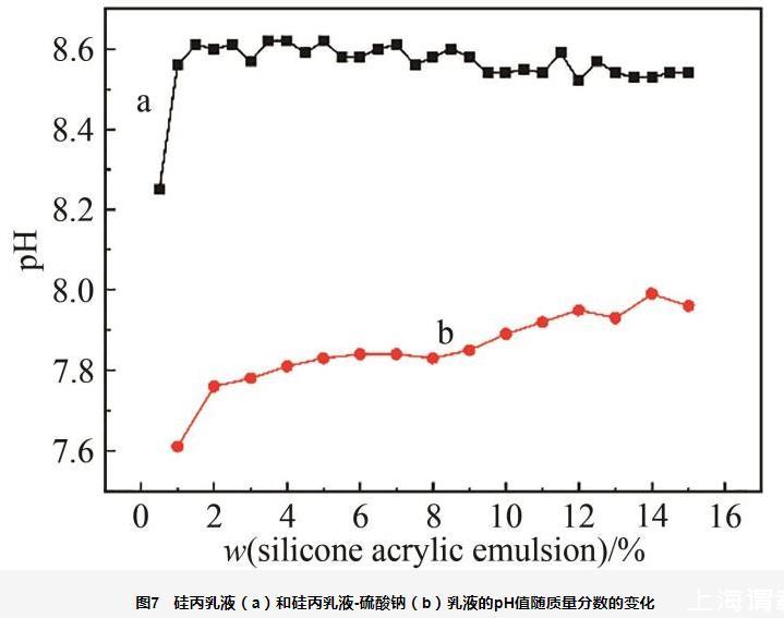 測定20℃下不同質量分數(1%~15%)的硅丙乳液和硅丙乳液-硫酸鈉的pH值變化,結果見圖7??梢钥闯?,隨乳液質量分數從0.5%到2%的增大,pH值逐漸由8.25上升到8.63,這是因為稀釋堿性乳液可以降低溶液的pH值;之后在2%~15%范圍內,pH值基本保持在8.63,說明乳液在溶液中含量過飽和,達到電離平衡,呈現弱堿性(圖7曲線a)。當硅丙乳液中加入質量分數1%的硫酸鈉時,Na+會對聚合物鏈形成“電荷屏蔽效應”和“離子交聯”效應使乳液體積收縮,導致乳液中的—COO-被部分質子化轉變為—COOH,導致—COO-的電離能力下降,故和硅丙乳液相比,硅丙乳液-硫酸鈉的pH值下降(圖7曲線b)。