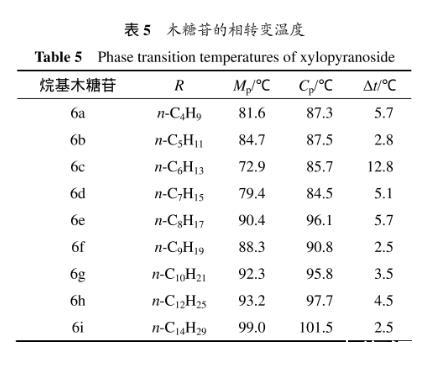具有液晶特征的化合物因加熱而呈現(xiàn)所謂的“雙熔融轉(zhuǎn)變”的相變現(xiàn)象,當(dāng)加熱達(dá)到其熔點(diǎn)(p)時(shí),結(jié)晶性的固態(tài)首先轉(zhuǎn)變成半透明的液晶態(tài),接著在較高的溫度(p)下轉(zhuǎn)變成各向同性的清亮的液態(tài)。表5所示為木糖苷的相轉(zhuǎn)變溫度。從表5可見:烷基-β-D-吡喃木糖苷屬于一頭一尾(one head one tail)或一頭組一鏈(one head group-one chain)且呈現(xiàn)多態(tài)性的雙親吡喃糖苷分子,在加熱時(shí)其相變發(fā)生在相對(duì)較小的溫度區(qū)間,但都出現(xiàn)了液晶相,且當(dāng)疏水性烷基碳鏈長(zhǎng)度為6時(shí),烷基-β-D-吡喃木糖苷相變溫度之差(Δ)較大,其他的都比較接近。在木糖苷中,烷基有助于提升分子取向的穩(wěn)定性,且這種穩(wěn)定性對(duì)液晶相的生成是必要的。但由于烷基-β-D-吡喃木糖苷為環(huán)狀的糖苷只有3個(gè)游離羥基,比烷基--D-吡喃葡萄糖苷少了親水性頭部的糖環(huán)上的羥甲基,也比木糖醇的十二烷基單醚少了1個(gè)游離的羥基,清亮點(diǎn)p不高,所以,得到的烷基-β-D-吡喃木糖苷具有液晶相,但相變溫度范圍(?=p?p)較窄,液晶相的穩(wěn)定性較弱。