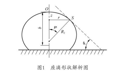 座滴法是基于熔體(液體)在水平托板表面形成穩定橢球液滴的形狀參數測量表面張力的方法[6]。基于座滴法測量玻璃熔體表面張力,玻璃熔體在水平托板上受重力和表面張力共同作用形成旋轉軸對稱橢球[7](圖1),橢球表面任一點的壓力差與表面張力之間的數學關系見式(1):