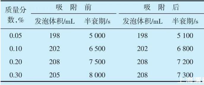 配制質量分數為0.05%,0.10%,0.20%和0.30%的磺基甜菜堿泡沫劑,再分別充入純度為99.9%的氮氣,利用羅氏泡沫儀測試氮氣泡沫體系吸附前后的泡沫性能。評價結果(表1)表明,當溫度為80℃時,不同質量分數的氮氣泡沫體系在吸附前后發(fā)泡體積均保持在200 mL左右,半衰期大于5 000 s,表明均具有良好的起泡性能和穩(wěn)定性能。
